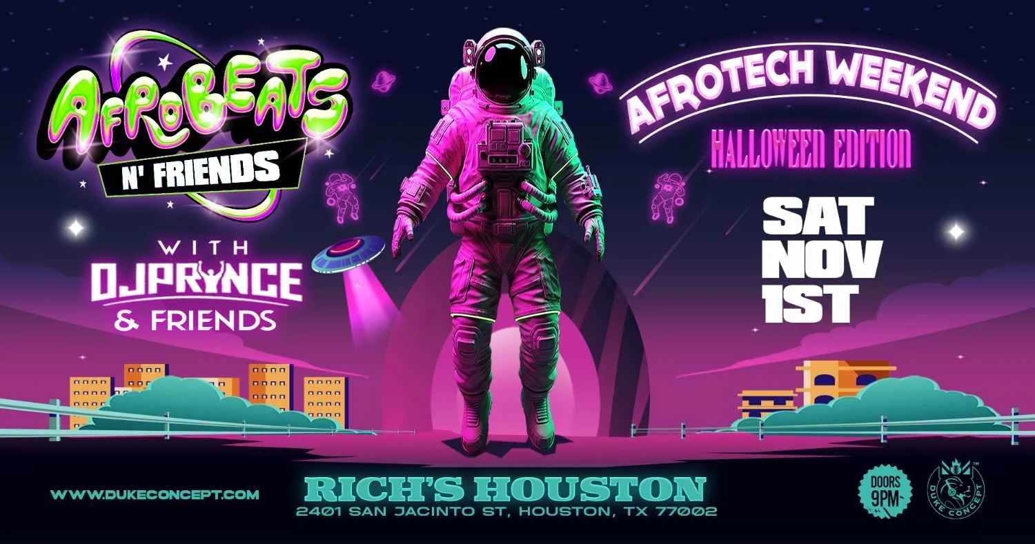 Afrobeats N’ Friends with DJ Prince & Friends, Halloween Edition in Houston, TX, Nov 1 at Rich’s Houston. Tickets available — grab yours now!