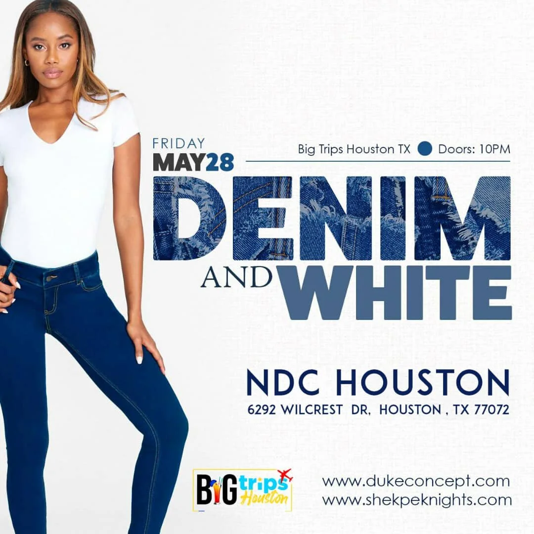Event flyer for a denim and white fashion event on May 28 in Houston, Texas, featuring a woman wearing a white shirt and blue jeans, with event details and website links.