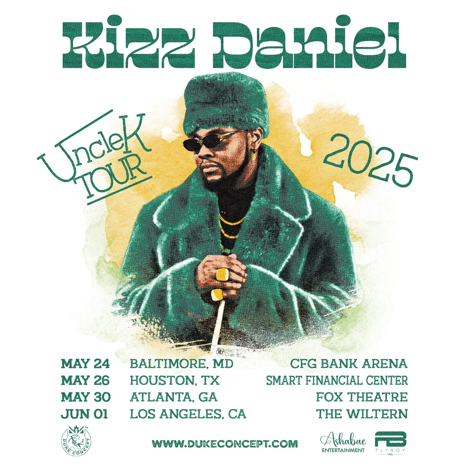 KIZZ DANIEL SUBSCRIBE FOR UPDATES KIZZ DANIEL - UNCLE K TOUR 2 Name * First Name Last Name Email * Email is required to receive Duke Concept updates and offers electronically. State * Select your state Alabama, AL Alaska, AK Arizona, AZ Arkansas, AR California, CA Colorado, CO Connecticut, CT Delaware, DE District Of Columbia, DC Florida, FL Georgia, GA Hawaii, HI Idaho, ID Illinois, IL Indiana, IN Iowa, IA Kansas, KS Kentucky, KY Louisiana, LA Maine, ME Maryland, MD Massachusetts, MA Michigan, MI Minnesota, MN Mississippi, MS Missouri, MO Montana, MT Nebraska, NE Nevada, NV New Hampshire, NH New Jersey, NJ New Mexico, NM New York, NY North Carolina, NC North Dakota, ND Ohio, OH Oklahoma, OK Oregon, OR Pennsylvania, PA Rhode Island, RI South Carolina, SC South Dakota, SD Tennessee, TN Texas, TX Utah, UT Vermont, VT Virginia, VA Washington, WA West Virginia, WV Wisconsin, WI Wyoming, WY Puerto Rico, PR U.S. Virgin Islands, VI Alberta British Columbia Manitoba New Brunswick Newfoundland and Labrador Nova Scotia Ontario Prince Edward Island Quebec Saskatchewan Northwest Territories Nunavut Yukon Others Phone * (###) ### #### Terms and Conditions * Yes, I would like Duke Concept LLC to contact me electronically, which may include but are not limited to communications via email and phone. Thank you! Kizz Daniel Uncle K Tour 2025 MAY 24, 2025 BALTIMORE, MD CFG BANK ARENA Get Tickets MAY 26, 2025 HOUSTON, TX SMART FINANCIAL CENTER Get Tickets MAY 30, 2025 ATLANTA, GA FOX THEATRE Get Tickets JUN 01, 2025 LOS ANGELES, CA THE WILTERN Get Tickets Don't Miss The Afrobeat Experience of 2025! 🔥 SECURE YOUR TICKETS NOW
